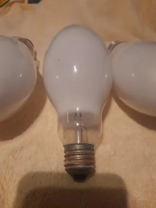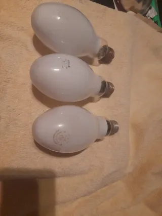 Lote de 3 bombillas de alta potencia para alumbrado público o focos. Tienen 15 cm de longitud y 8 cm ancho. A 10 E cada una. 25 E el lote de 3. - Potencia: 160 W - Marca: 1 marca OSRAM. 1 marca Phillips y otra marca Mazda. - Voltaje: 220-240 V Recién comprobadas iluminan bien.