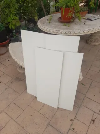 Conjunto de baldosas de gres cerámico blanco ideales para revestimientos. 2 placas enteras de 90 por 30 cm y dos recortadas de 77 por 30 cm. Total medio (0.5 m2). Lote por 6 E. - Material: Gres cerámico. - Color: Blanco.