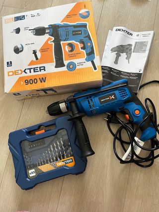 Taladro percutor Dexter de 900W con empuñadura auxiliar y maletín. - Incluye un set de 33 brocas y puntas. - Usado una vez (definitivamente no soy muy manitas 😊)