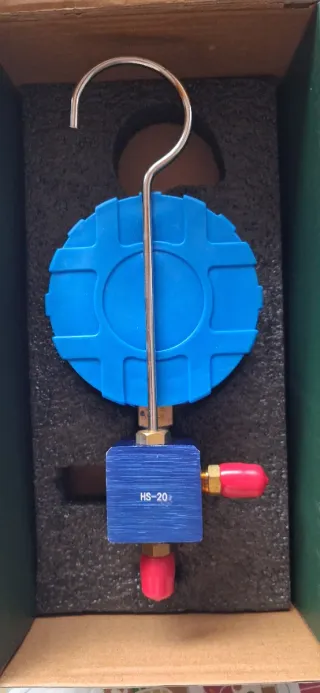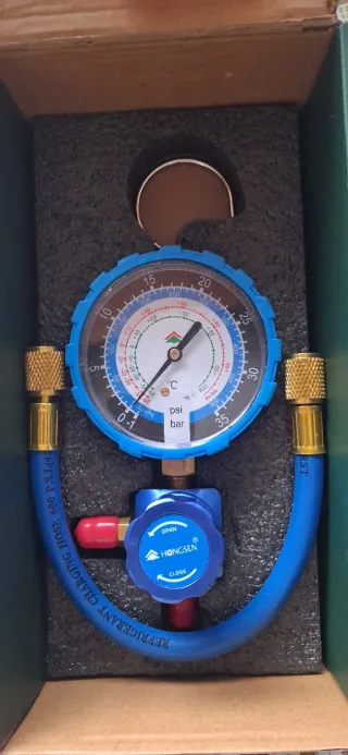 Manómetro para medir la presión de aire acondicionado. - Incluye manguera de carga. - Escala en psi y bar. - Marca: HONGSEN. Se vende porque se compró y no se ha usado nunca