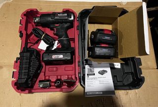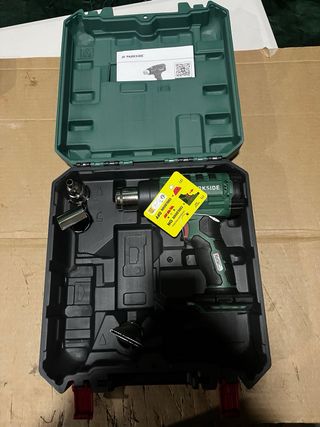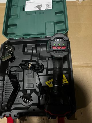 Llave de impacto inalámbrica Parkside Performance. - Motor sin escobillas para mayor durabilidad. - Velocidad sin carga: 0-1500 / 0-3000 rpm. - Par de apriete máximo: 600 Nm. - Portabrocas: Cuadrado exterior de 1/2. - Preselección de par en 2 niveles: 120 / 400 Nm. - Se vende sin batería ni cargador. Tiene un pequeño roto en el maletin no afecta en nada