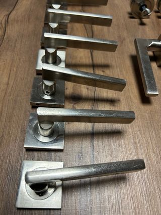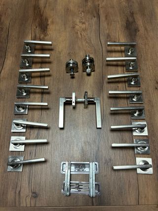 Conjunto de manetas para puertas, fabricadas en acero inoxidable con un acabado moderno. - Incluye 9 manetas de puerta. - Diseño cuadrado y elegante. - Accesorios de montaje incluidos. - Incluye dos pestillos Han sido usadas y tienen marcas del uso, pero son de buena calidad