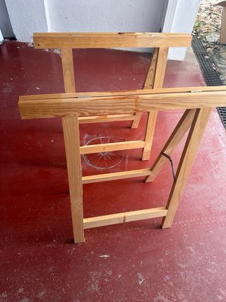 Se venden dos caballetes de madera plegables. Son de madera clara y parecen estar en buen estado. - De madera. - Plegables. - Dos unidades.