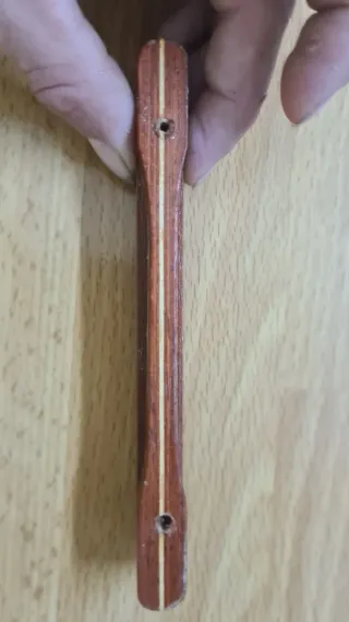 Vendo pomos/tiradores de madera maciza para armarios de cocina o muebles. Diseño con detalle decorativo central en líneas claras y oscuras, muy elegante y atemporal. ✨ Características: Material: madera barnizada Color: tono marrón rojizo Estilo clásico / rústico / vintage Incluyen orificios para tornillos (ver fotos) que estan a 9,5cm de centro a centro. En buen estado general (ver imágenes reales) 📏 Ideales para: Armarios de cocina Cajones Muebles auxiliares o restauración 📦 Se venden en conjunto o por unidades (a concretar). 📍 Entrega en mano o envío a cargo del comprador. 0,5€ por pieza, 8unidades