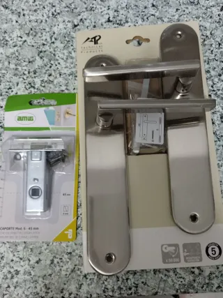 Juego de manetas para puerta en color plata. Incluye cerradura y tornillería. - Modelo: CAPORTE Mod. 6-45 mm - Material: Metal - Acabado: Plateado
