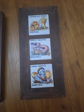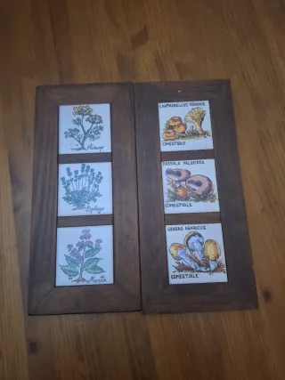 Conjunto de dos piezas decorativas con azulejos enmarcados en madera. - Un azulejo muestra Hinojo, Espliego y Menta. - El otro azulejo presenta Cantharellus Cibarius, Russula Paludosa y Genero Agaricus con ilustraciones de setas.