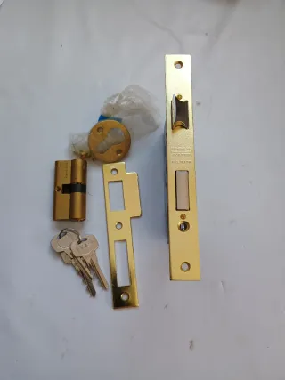 Se vende cerradura TESA de color dorado, ideal para puertas. - Incluye el mecanismo de la cerradura. - Incluye placa de metal para el marco. - Incluye cilindro de seguridad. - Incluye dos llaves.