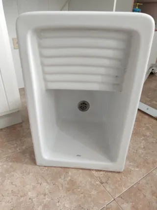 Pila de lavadero de la marca ROCA. Incluye las patas. - Material de cerámica blanca. - Diseño con relieve para frotar. - Incluye desagüe metálico.