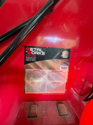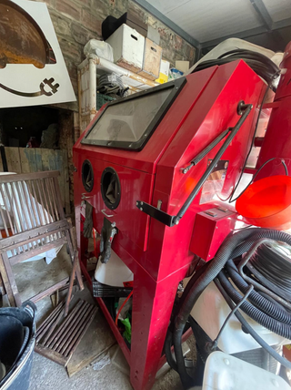 Equipo de arenado profesional en color rojo. Con muy pocas horas de uso Precio original 3,300 € Opcion de vender un compresor trifasico seminuevo • Puertas de acceso por ambos lados • Ventana superior para visualización. • cuatro orificios laterales para guantes. - Guantes integrados. Precio final 1.950,00 euros