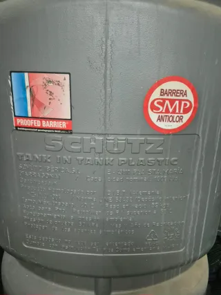 Tanque de plástico SCHÜTZ modelo TANK IN TANK PLASTIC. - Capacidad nominal: 1000 Lts. - Fabricado por SCHÜTZ IBÉRICA S.L. en Tarragona. - Producto homologado por D.U.B.T. (Alemania). - Cumple norma UNE 53432 (Depósito interior). - Apto para Propanol, Petroliferos. - Presión de prueba: 50 kPa. - Barrera SMP antíolor.