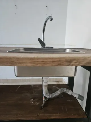 Barra de madera natural con lavabo integrado. Ideal para cocinas o espacios exteriores. - Diseño rústico y moderno. - Encimera de madera maciza. - Lavabo de acero inoxidable. Medidas 5,20 alto95 profundo 65