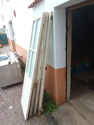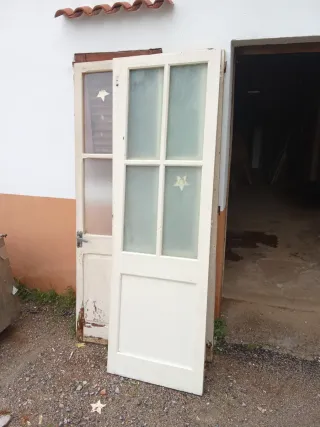 Conjunto de puertas de madera blancas, con detalles de cristal. - Puertas con marcos de madera. - Bisagras metálicas visibles.