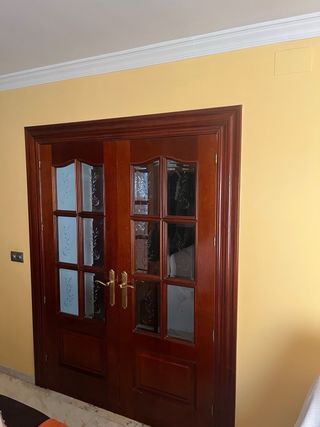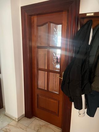 Puerta de interior de madera con detalles de cristal esmerilado. En total 7 puertas - Diseño clásico con paneles. - Marco de madera oscura. - Tirador metálico dorado. Precio interiores 65€ Precio en cristal 70-90€ En total 5 interiores Una unidad en vidrio Una doble de doss hojas en vidrio