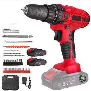 Taladro atornillador inalambrico con accesorios. Baterías recargables. Par de torsion de 32N.m con 18+1 ajustes del par. Función taladro y atornillador, 2 velocidades y giro en 2 direcciones. Mandril de 3 mandíbulas sin llave y luz led. -Taladro atornillador inalámbrico. -2 Baterías recargables 21V. -Cargador. -Juego de brocas. -Juego de puntas planas y estrella. -Juego de vasos. -Extensión flexible. -Maletín de transporte.