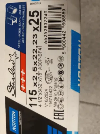 Discos de corte para metal de la marca Norton, modelo A30P-BF41. - Diámetro: 115 mm. - Eje: 22,23 mm. - Grosor: 2,5 mm. - Fabricado en Polonia.