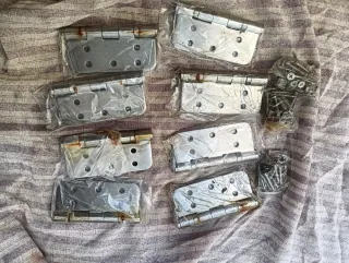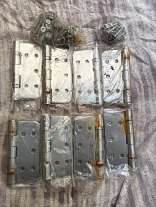 Juego de 5 bisagras especiales de acero inoxidable. - Medidas: 100x89x3 mm. - Con rodamientos. - Canto reducido. - Material: Acero Inoxidable 304. Un poco sucias nunca usadas.