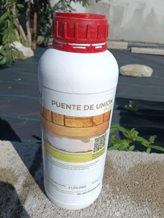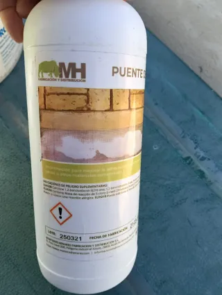Imprimación para mejorar la adherencia entre morteros, yesos y otros materiales cementosos. (Solo se uso un par de cucharadas) - Contiene 1,2-bencisotiazol-3(2H)-ona y 1,2-bencisotiazolin-3-ona. - Puede provocar reacción alérgica. - Lote: 250321 - Fecha de fabricación: 21-09