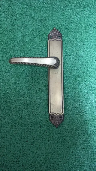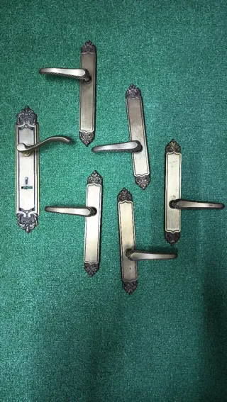 Manillas de puerta con un diseño vintage y detalles ornamentales. - Se vende por parejas o lote completo de 8. - Precio par: 20€ - Precio 8 pares: 120€ - Precio puerta entrada: 15€ - Acabado metálico envejecido. - Detalles decorativos en los extremos. - Diseño clásico con placas ornamentadas en acabado bronce/latón