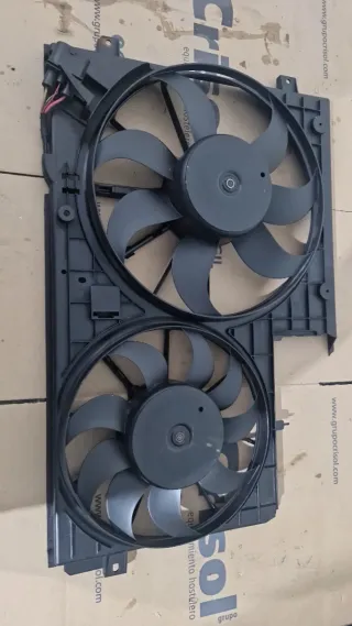 Electroventilador doble para radiador de coche. Se compone de dos ventiladores unidos en una misma carcasa. - Carcasa de plástico negro. - Dos motores eléctricos. - Conector de alimentación.