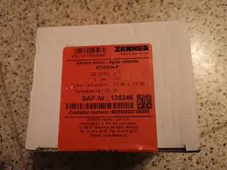 Contador de agua caliente Zenner modelo ETWD-N-P. Tengo cuatro, podríamos ajustar precio todos juntos. - Caudal Q3: 2,5 m³/h. - Longitud L: 115 mm. - Rosca: G7/8B x G3/4B. - Temperatura máxima: 90 °C. - Número SAP: 136246. - Número de contador: 9ZRI0023745008.