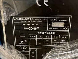 Grupo de soldadura APEL MIG-382. - Modelo: APEL MIG-382 - Tensión: 40A/16V - 380A/33V - Frecuencia: ~ 50 Hz - Certificación: EN 60947-1/CE - Ciclo de trabajo: 60% (380A) / 100% (295A) - Tensión en vacío: 33V / 29V - Corriente de soldadura: 42A / 33A - Potencia: 10,00 KVA / 13,25 KVA DISPONIBLES VARIOS GRUPOS DE SOLDAR