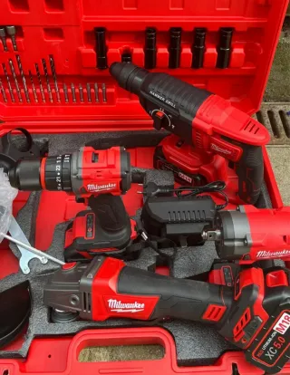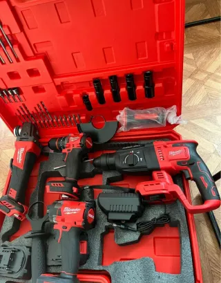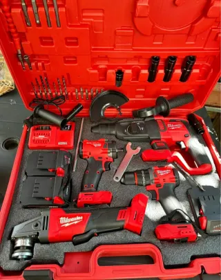 Set de herramientas eléctricas Milwaukee. - Taladro percutor - Amoladora angular - Llave de impacto - Cargador M18 - 3 Batería M18 XC 5.0 -Radial