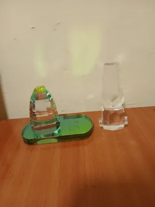 Dos piezas de cristal decorativas para el hogar. - Una pieza con base ovalada verde y figura facetada con toques verdes y amarillos. - Otra pieza transparente con base facetada y figura alta y facetada.