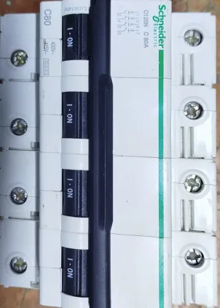 Magnetotérmico de la marca Schneider Electric, modelo C80. - Cuatro polos. - Intensidad nominal: 80A. - Curva C. - Tensión nominal: 400V~ / 415V~. - Poder de corte: 10000.