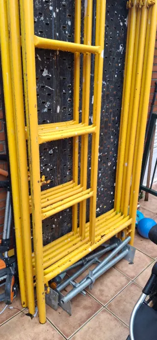 Andamio metálico de color amarillo, ideal para trabajos en altura. Se encuentra en buen estado apenas usado con patas para desnivel - Estructura robusta. - Barras de soporte. - Base ajustable.