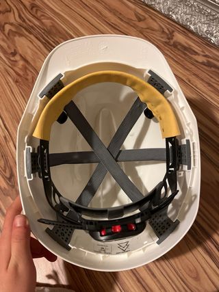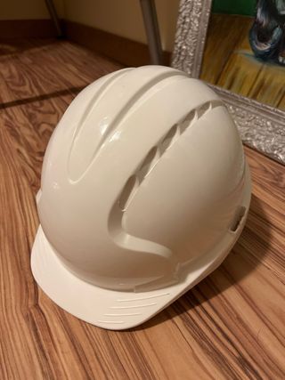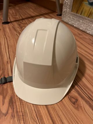 Casco de seguridad de color blanco, diseñado para protección. -Material resistente. -Diseño ergonómico. -Correa ajustable.