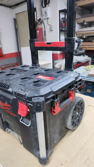 Carro de transporte Milwaukee PACKOUT. - Color negro con detalles rojos. - Asa de transporte metálica.