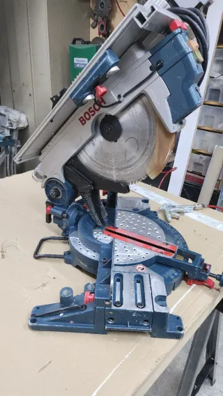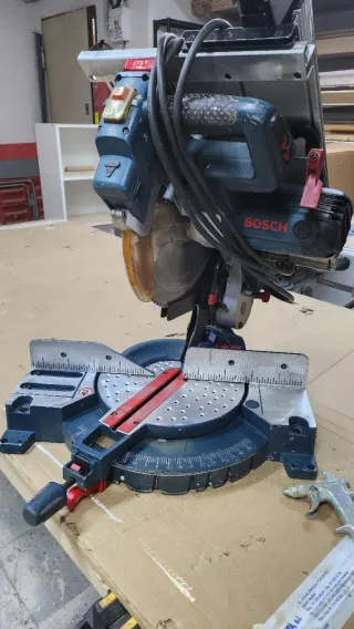 Ingletadora de la marca Bosch, modelo GSM. Herramienta de corte versátil para trabajos de carpintería. - Diseño robusto y duradero. - Escala de inglete y bisel para cortes precisos. - Asa ergonómica para un mejor agarre.