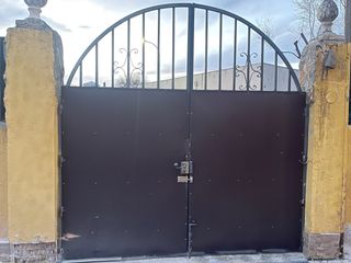 Puerta de garaje de metal oscuro, con diseño curvo en la parte superior y detalles ornamentales. MEDIDAS: ancho: 250cm alto: 166cm sin arco y con el arco superio 240cm - Estructura robusta. - Acabado en color oscuro. - Incluye cerradura y pestillo.