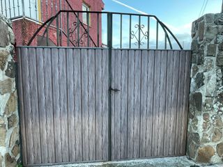 Puerta de patio con un diseño que imita la madera. Ideal para accesos exteriores. Medidas: alto sin el arco: 170cm y ancho: 251cm - Acabado en tonos grises y marrones. - Estructura metálica. - Incluye manilla.