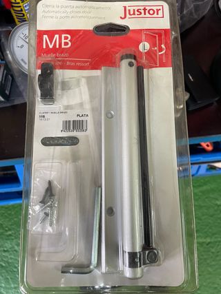 Cierre automático para puertas de la marca Justor, modelo MB. - Color: Plata. - Incluye muelle y brazo. - Incluye tornillería y llave Allen.