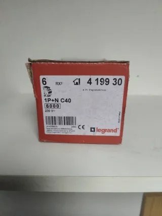 Caja 5 Magnetotérmicos Legrand RX3 C40. - Intensidad: 6 kA. - Tensión: 230 V~. - Tipo: 1P+N C40. - Modelo: 4 199 30.