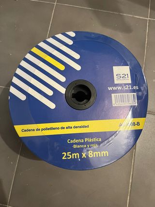 Cadena de polietileno de alta densidad, ideal para señalización. Nueva sin usar. - Color: Blanca y roja. - Longitud: 25 metros. - Ancho: 8mm. - Marca: S21 Señalización.