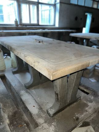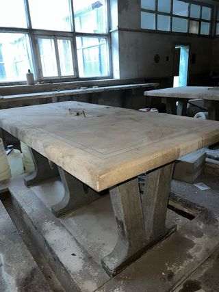 Mesa de mármol con base robusta. - Superficie de mármol. - Base de soporte de piedra.