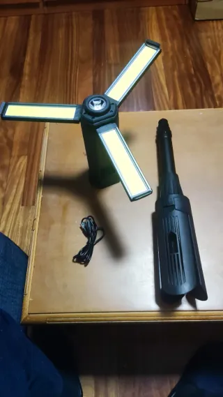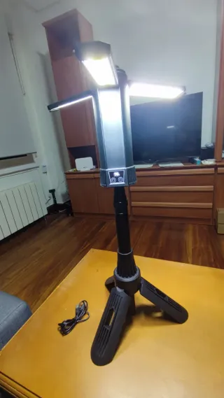 Potente lámpara de trabajo LED con diseño recargable y trípode. - Iluminación potente y versátil. - Base de trípode estable. - Cable de carga incluido.