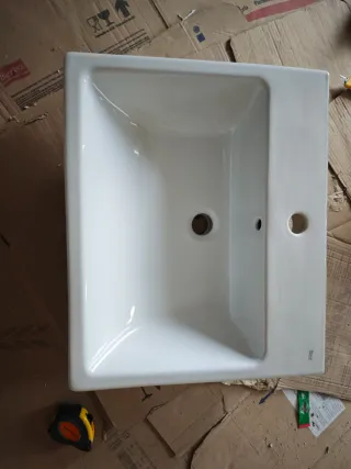 Lavabo de la marca Roca con unas medidas de 55,5 cm de ancho por 45,5 cm de fondo. - Diseño moderno y funcional. - Material cerámico de alta calidad. Nos lo dejaron en nuestro edificio de obra nueva, y lo hemos cambiado, por lo que está sin usar. En la parte que va contra la pared tiene algunos restos de sika por haber estado pegado. DISPONIBLE 2 UNIDADES. PRECIO 59,99€/UNIDAD. Preguntar.