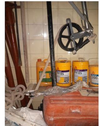 Lote de herramientas para trabajos de albañilería y fontanería. - Cubos erramienta - Bidón naranja. - Cuerda enrollada. - Polea. - Palos de madera.