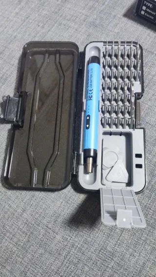 Set de destornillador eléctrico de precisión con 48 puntas intercambiables. Incluye estuche para guardarlo todo. - Diseño compacto y ergonómico. - Carga vía USB. - Incluye herramientas de palanca