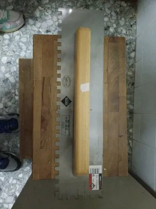 Herramienta para aplicar adhesivo en alicatados. - Hoja de acero inoxidable. - Mango de madera. - Borde dentado para distribuir el adhesivo.