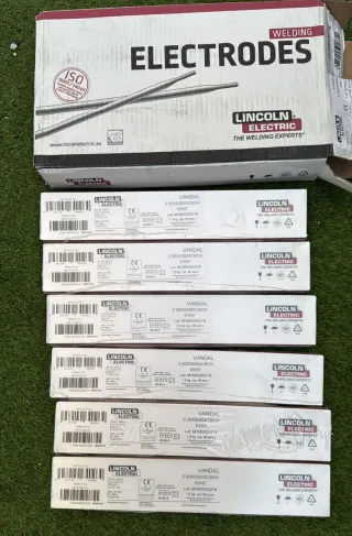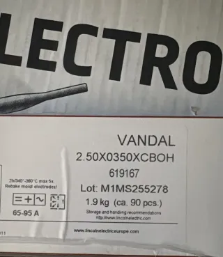 Electrodes de soldadura Vandal. 6 paquete por 25 euro todo lo que vee la foto paquete nuevo puede ver mi comentario que ya emos vendido a provechar... La oferta - Modelo: 2.50X0350XCBO - Lote: M1MS255278 - Peso: 1.9 kg ( cada paquete pesa lleva 6 paquete que es una caja - Rango de amperaje: 65-95 A - Instrucciones de horneado: 2h/340°-360°C max 5x