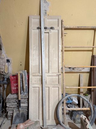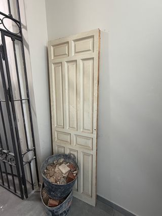 Puerta de paso de madera de los años 50. Presenta un diseño clásico con paneles. - Material: Madera. - Estilo: Años 50.
