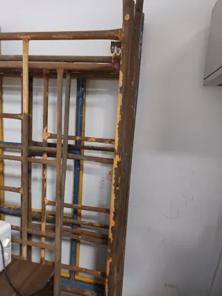 Se venden patas de andamio metálicas. - Material: Metal. - Color: Marrón con detalles en amarillo y azul.
