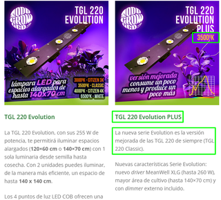 Lámpara LED TGL 220 Evolution PLUS. (ESTA SI ES 3500k) OJO: la que se vende sin "plus" no es 3500!!! - Versión mejorada. - Consume menos y produce más. La TGL 220 Plus te ofrece 4 puntos de luz integrados que te permitirán iluminar espacios alargados con una mayor eficiencia que la TGL 220 Classic. Con 2 unidades disponibles (160 € por unidad) puedes iluminar de la manera más eficiente un espacio de 120×120 cm hasta 140×140. Mejor entre en mano, para que se vea el estado del equipamiento. Está practicamete nuevo con poco uso. Gracias.