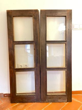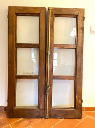 ventana de madera 80x118cms. sin marco. - Estructura de madera oscura. - Cada puerta tiene tres paneles de cristal. - Cierre de metal.