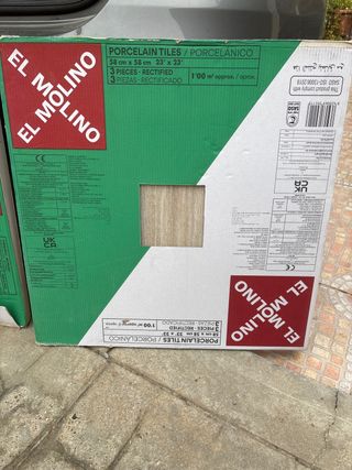 2 Cajas de baldosas de porcelánico de la marca El Molino. Son aptas para interior y tienen un acabado rectificado. - Marca: El Molino - Material: Porcelánico - Medidas: 58 cm x 58 cm (23 x 23) - Acabado: Rectificado - Cobertura: 1.00 m² aprox.