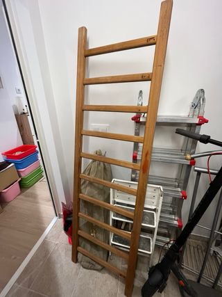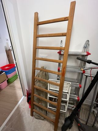 Escalera de 5 peldaños, ideal para alcanzar lugares altos en casa o en el trabajo. - Material: Aluminio - Altura: Aproximadamente 1.5 metros - Diseño plegable para fácil almacenamiento